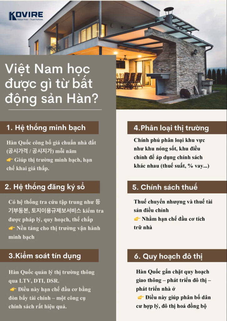 Hàn Quốc quản lý thị trường thông qua LTV, DTI, DSR. Điều này hạn chế đầu cơ bằng đòn bẩy tài chính – một công cụ chính sách rất hiệu quả.