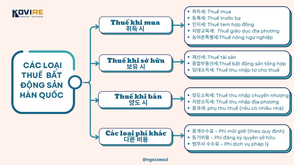 Trên thực tế, hệ thống thuế của bất động sản Hàn Quốc được thiết kế theo vòng đời của tài sản và chia thành ba giai đoạn chính: khi mua – khi sở hữu – khi bán. Ngoài ra còn có một số chi phí giao dịch bắt buộc.