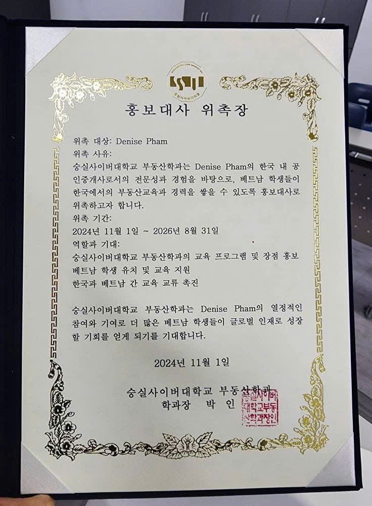 데니스 팜은 대한민국 숭실사이버대학교 부동산학과 학과장인 박인(Park In) 교수로부터 해당 학과의 홍보대사로 공식 임명되었습니다. 이번 임명은 그녀의 노력과 전문성을 인정하는 중요한 이정표일 뿐만 아니라, 베트남 학생 커뮤니티와 한국의 국제적 교육 환경을 보다 폭넓게 연결하는 계기를 마련합니다.